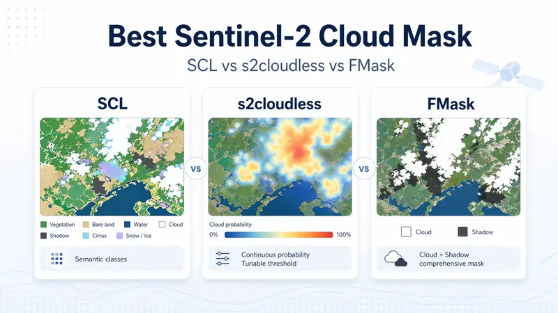 A practical comparison of Sentinel-2 SCL, s2cloudless, and FMask for near real-time monitoring, time-series analysis, and quality assurance workflows.